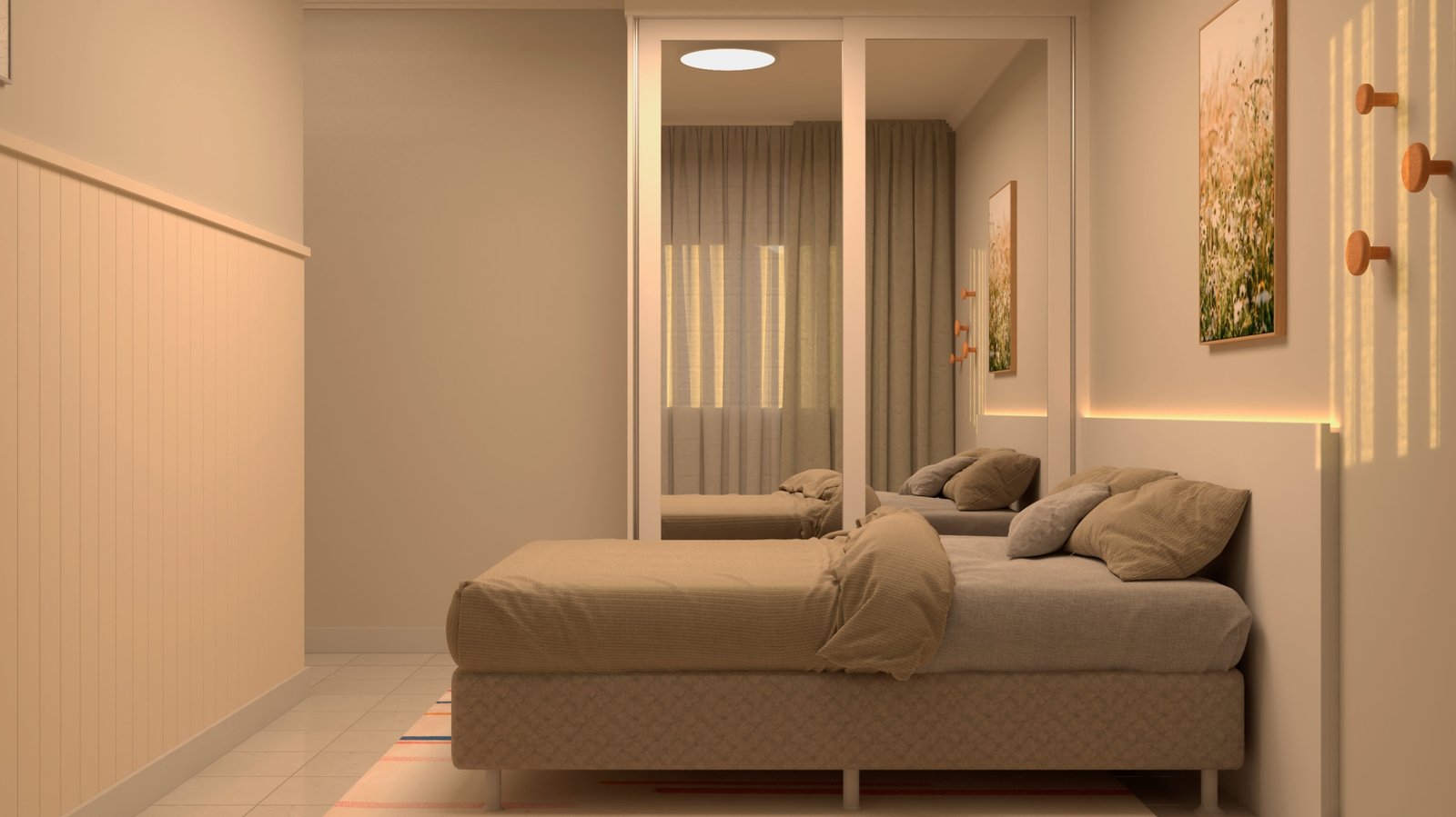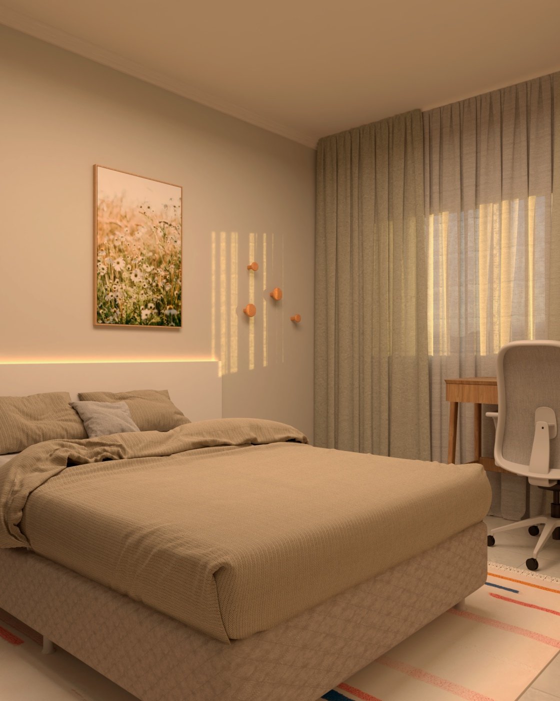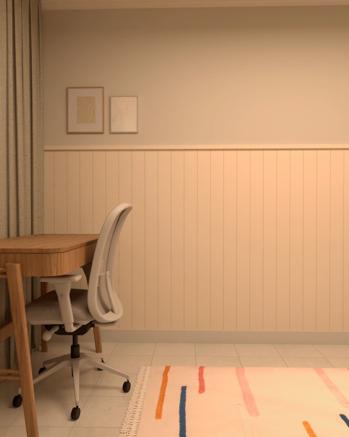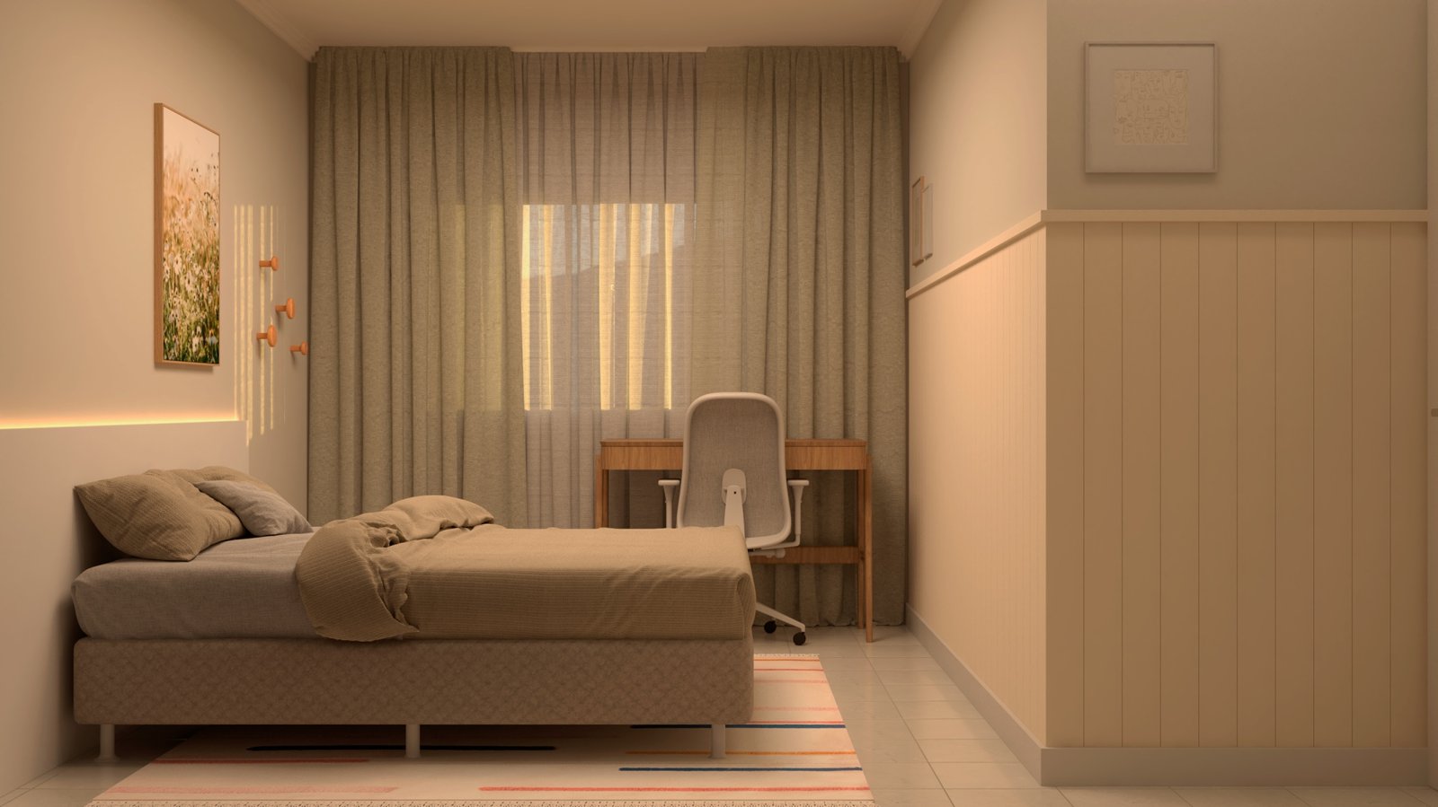 Para transformar esse ambiente, utilizei alguns recursos estratégicos. Quadros foram adicionados para dar vida às paredes e enriquecer a ambientação. O uso de tapetes e cortinas ajudou a criar uma atmosfera mais aconchegante e reduzir a reverberação sonora, tornando o espaço mais acolhedor. Para completar, apliquei shiplap na parede aos pés da cama, trazendo um toque de charme costeiro que remete ao clima praiano.