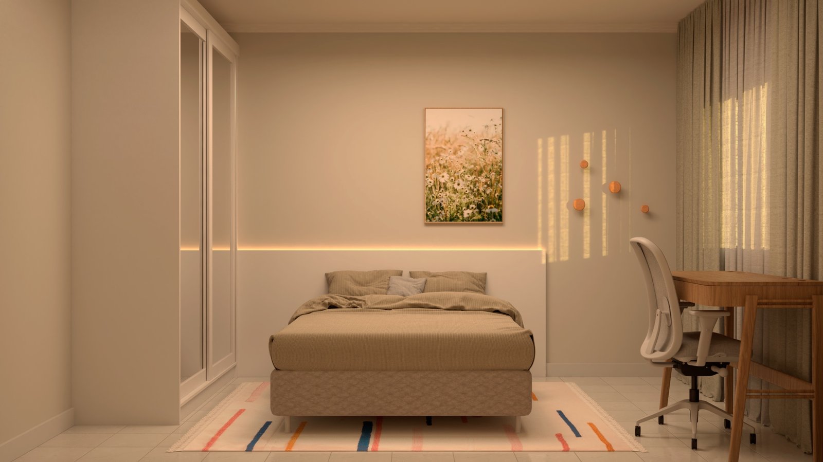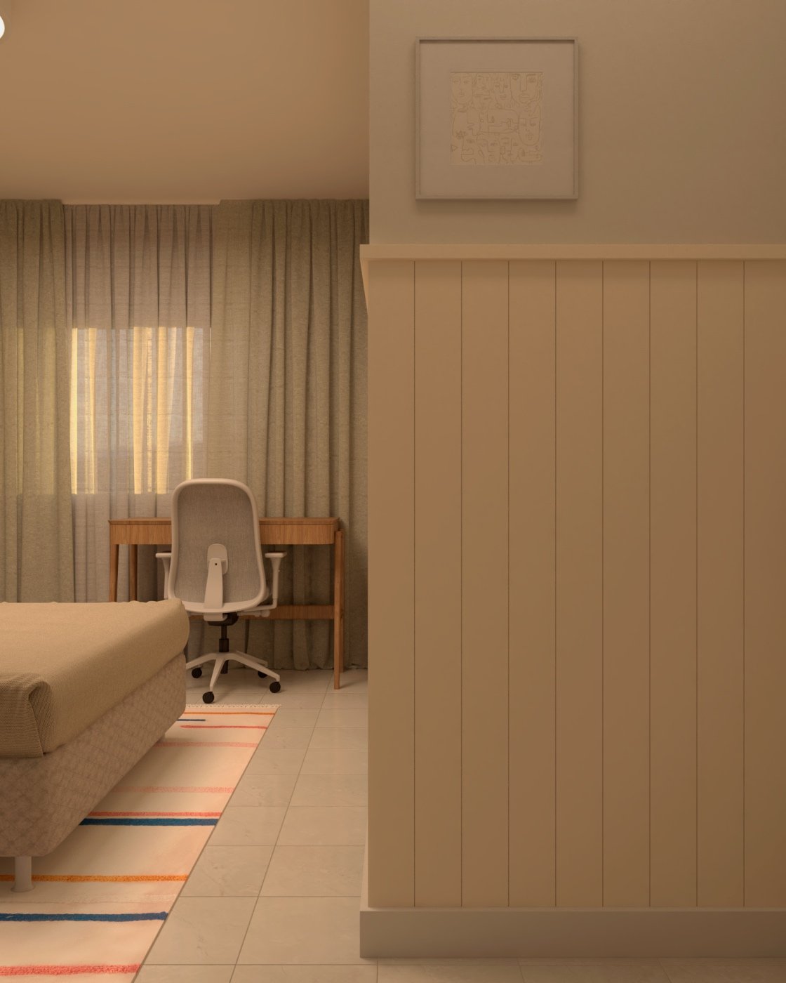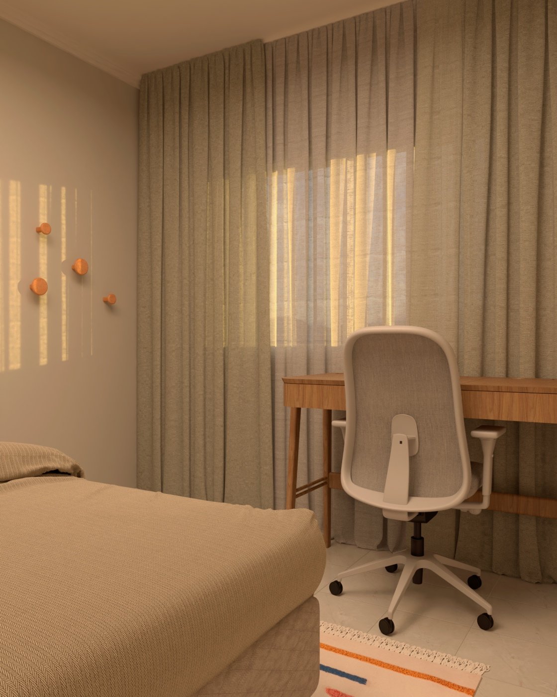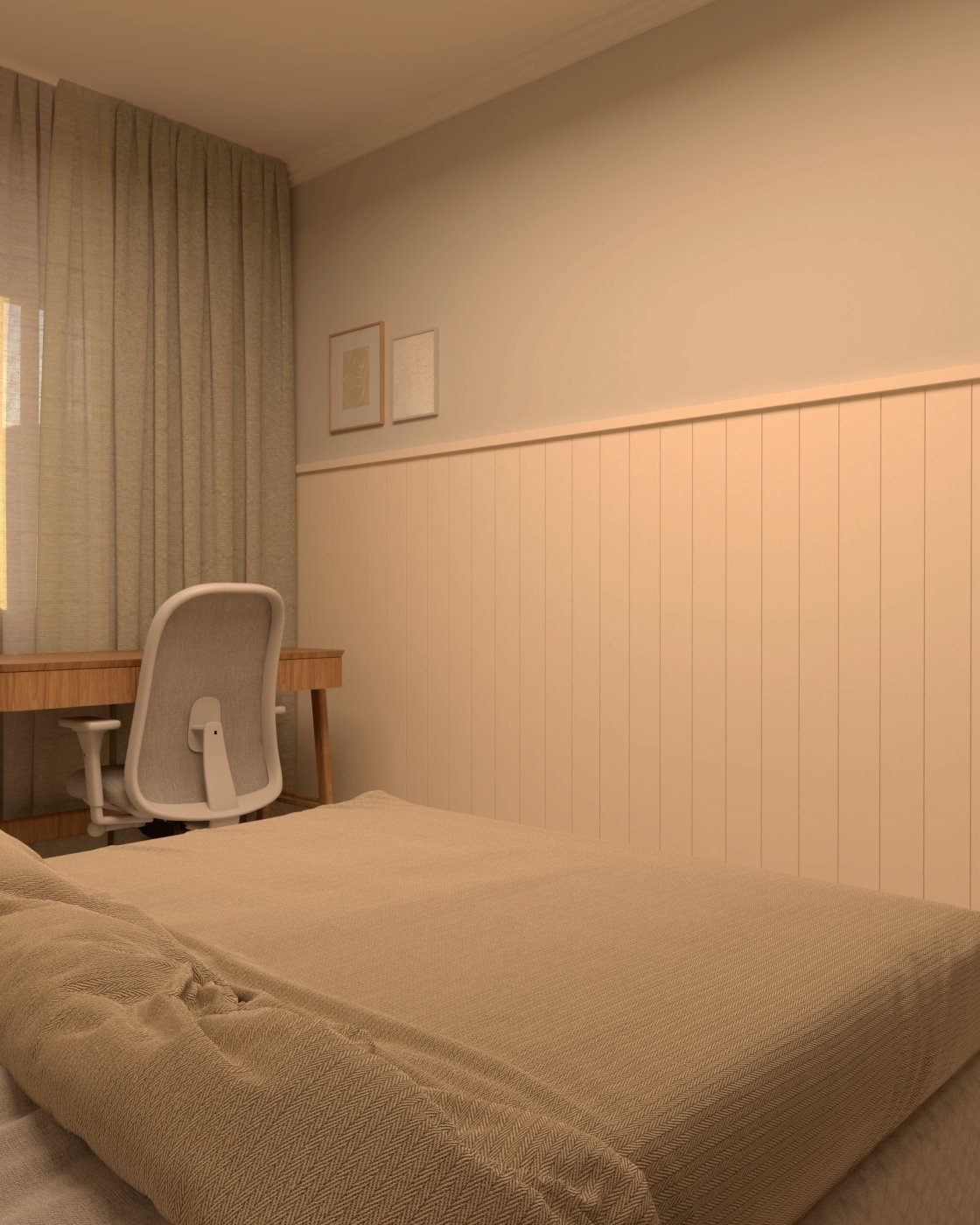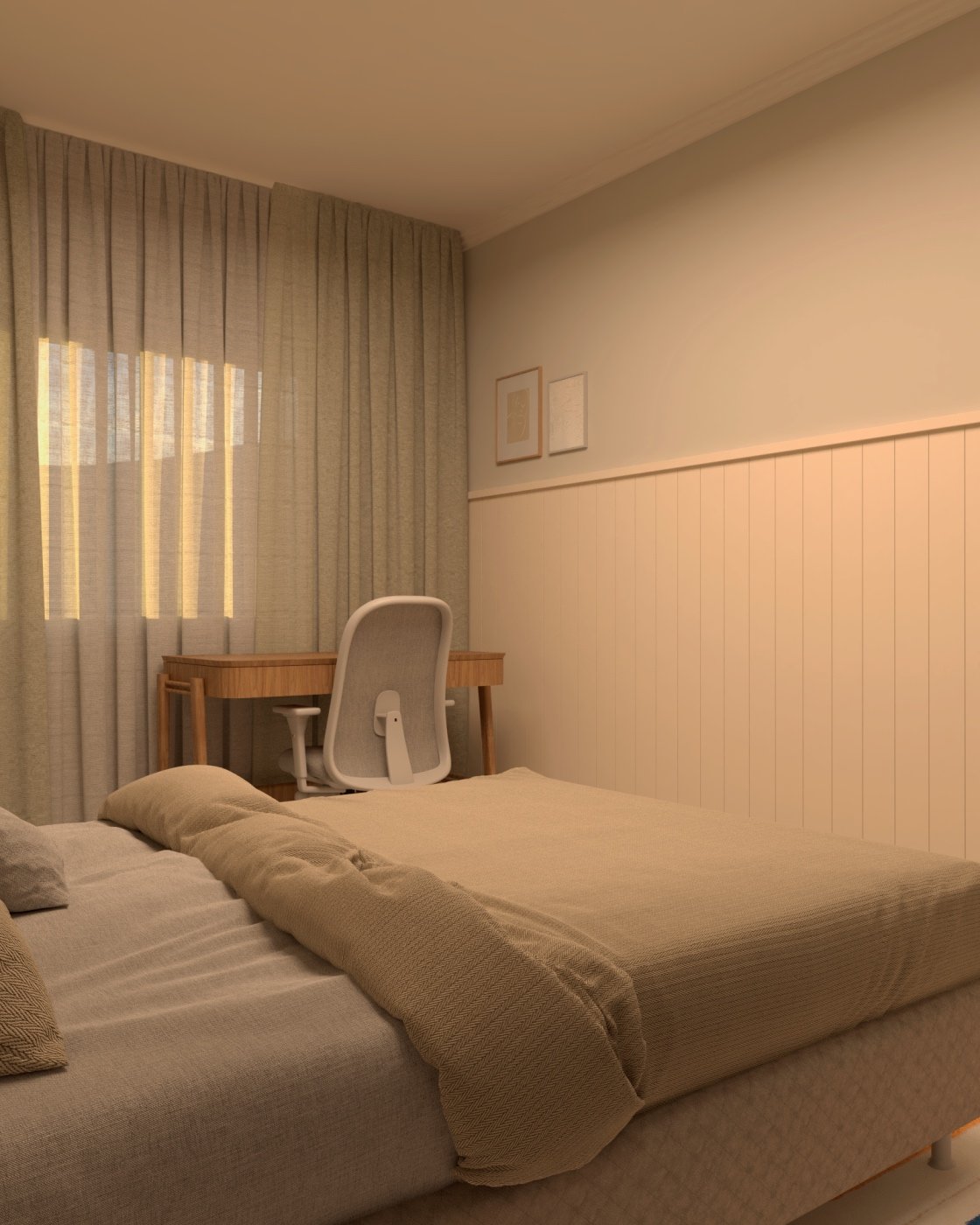O projeto do quarto Costa Serena teve início a partir de uma consultoria. Alguns elementos, como o armário, a cama e a cabeceira, já estavam presentes, mas havia oportunidades claras para aprimoramento. A pintura cinza das paredes foi mantida, mas o ambiente se mostrava vazio e carecia de acolhimento. Além disso, tornou-se evidente a necessidade de incluir um espaço de trabalho.